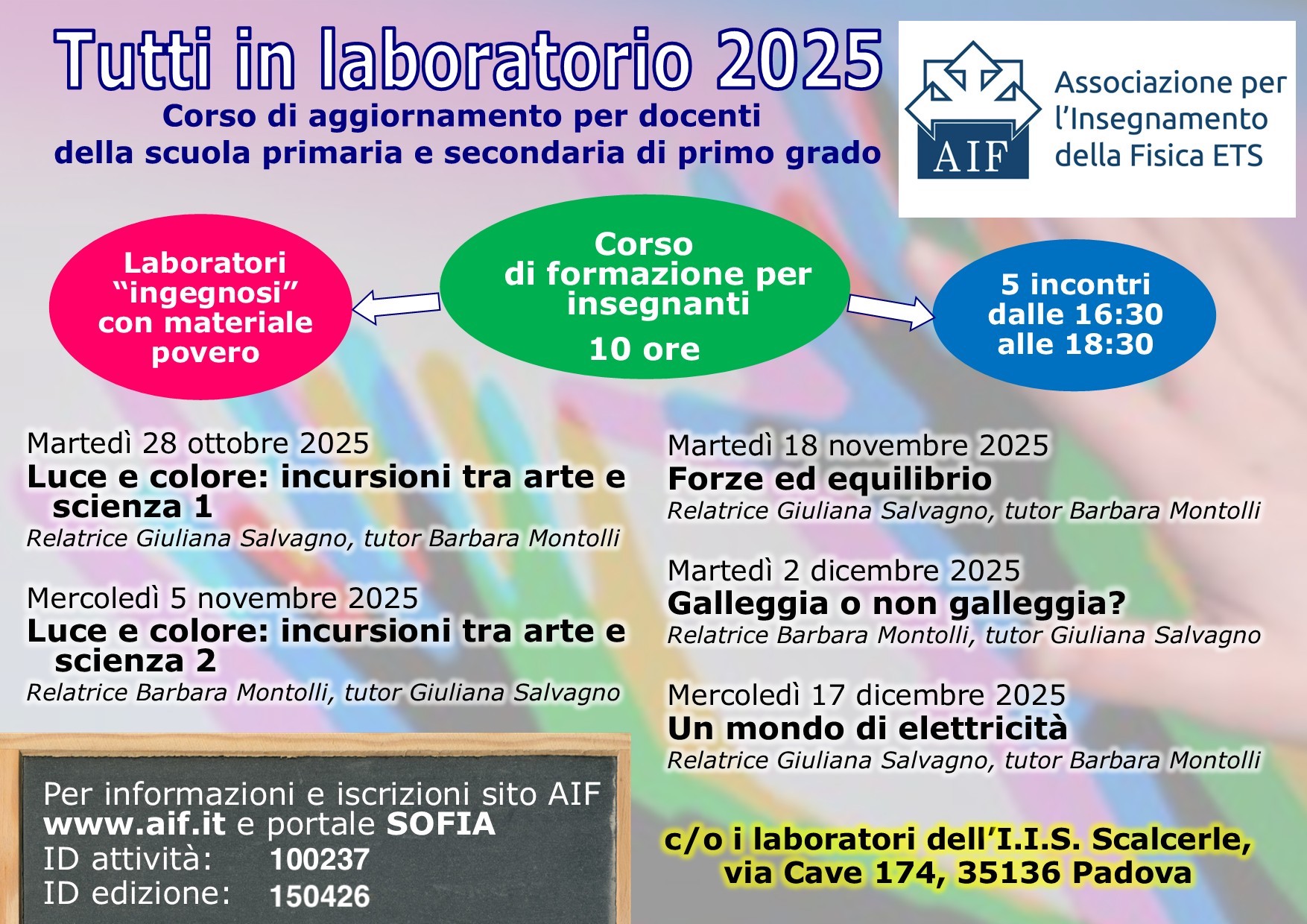 La Sezione AIF di Padova organizza il corso di formazione “Tutti in laboratorio 2025”. Il corso, rivolto agli insegnanti della scuola primaria e secondaria di primo grado, si svolgerà presso l’IIS Scalcerle di Padova dal 28 Ottobre al 17 Dicembre 2025.